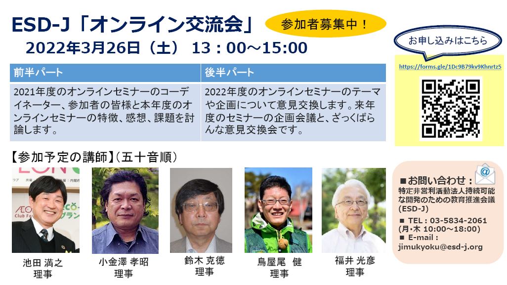 後半のパートは、2022年度のオンラインセミナーのテーマや企画について意見交換します。来年度のセミナーの企画会議と、ざっくばらんな意見交換会です。SDGs/ESD推進の課題や、オンラインセミナーへの期待など忌憚のないご意見をいただけると幸いです。