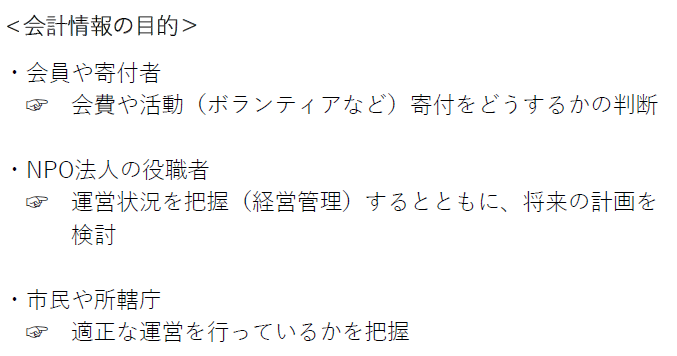 講師の江副裕美税理士より、公益法人・NPO法人の定義、NPO法の内容・その改正内容、NPO法人の管理運営、会計処理の流れ、特にNPO法人が毎年作成・提出が求められる書類について、会計情報の目的(下記スライド参照)や活動計算書の意義、貸借対照表、財産目録の科目や決算手続きの解説、財務諸表の注記として記載すべき内容などを含め、ご説明いただきました。