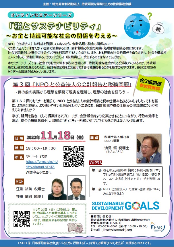 【告知】オンラインセミナーシリーズ「税とサステナビリティ」第3回 「NPOと公益法人の会計報告と税務問題」 横田 美保 投稿日: 2022/10/192022/12/20 お知らせ, 人材育成 「税とサステナビリティ」 ~お金と持続可能な社会の関係を考える~ NPO(公益法人)は利益を目指していないから、会計処理も税金も関係ない・・・そう思い込んでいませんか?社会で活動するには、会計報告と税金の知識・処理は最低限必要になります。社会で活動をした場合に社会インフラを利活用するという点でも、また、ある程度の社会的責任を負う点でも、社会を構成する人に対して、活動に関するアカウンタビリティ(説明責任)が生ずるのではないでしょうか。 本セミナーシリーズでは、社会でのお金の流れや税の仕組みが、持続可能な社会作りとどう関わっているのか、持続可能な社会創りを進めるために、会計報告と税をどう活用できる可能性があるのかを基本から学びます。さらには理想のあり方への議論を試みたいと思います。 第3回 「NPOと公益法人の会計報告と税務問題」~目の前の実務から理想を夢見て現実を理解し、理想の社会を語ろう~ 第1&2回のセミナーを通じて、NPOと公益法人の会計報告と税の仕組みをおさらいしました。それを基に、より深く理解し、より使いやすい仕組みとしていくためにも、会計報告や税の仕組みの理想像について考えてみませんか?学び、疑問を抱き、そして提案するアプローチが、会計報告をより充実させることにつながり、行政の効率を高め、税金の無駄を縮小し、理想のコミュニティー形成に近づくことになるのではないかと思います。 1.日時:11月18日(金)18:00-19:30 2.講師:浅見 哲税理士(税理士法人 魁 代表・ESD-J監事)3.ゲスト:江副 裕美 税理士、神田 博則 税理士4.お申し込み:https://forms.gle/nU4MvX5unutLnTnTA お申し込みはこちら 【プログラム】第1部:税を考える週間の「納税で持続可能な日本」で行ってきた議論を踏まえ、税とESD、NPOをベースとした税に対するアプローチを考察します。第2部:NPO(公益法人)の運営・社会・税についてみんなで考えよう チラシのダウンロード ◆ 第1回 「公益法人の会計の基本」の報告ページはこちら ◆ 第2回「公益法人の税務の基本と課題」の報告ページはこちら ■お問い合わせ 特定非営利活動法人持続可能な開発のための教育推進会議(ESD-J) TEL:03-5834-2061(月・木 10:00~18:00) E-mail:jimukyoku★esd-j.org(★を@に変えてお送りください)