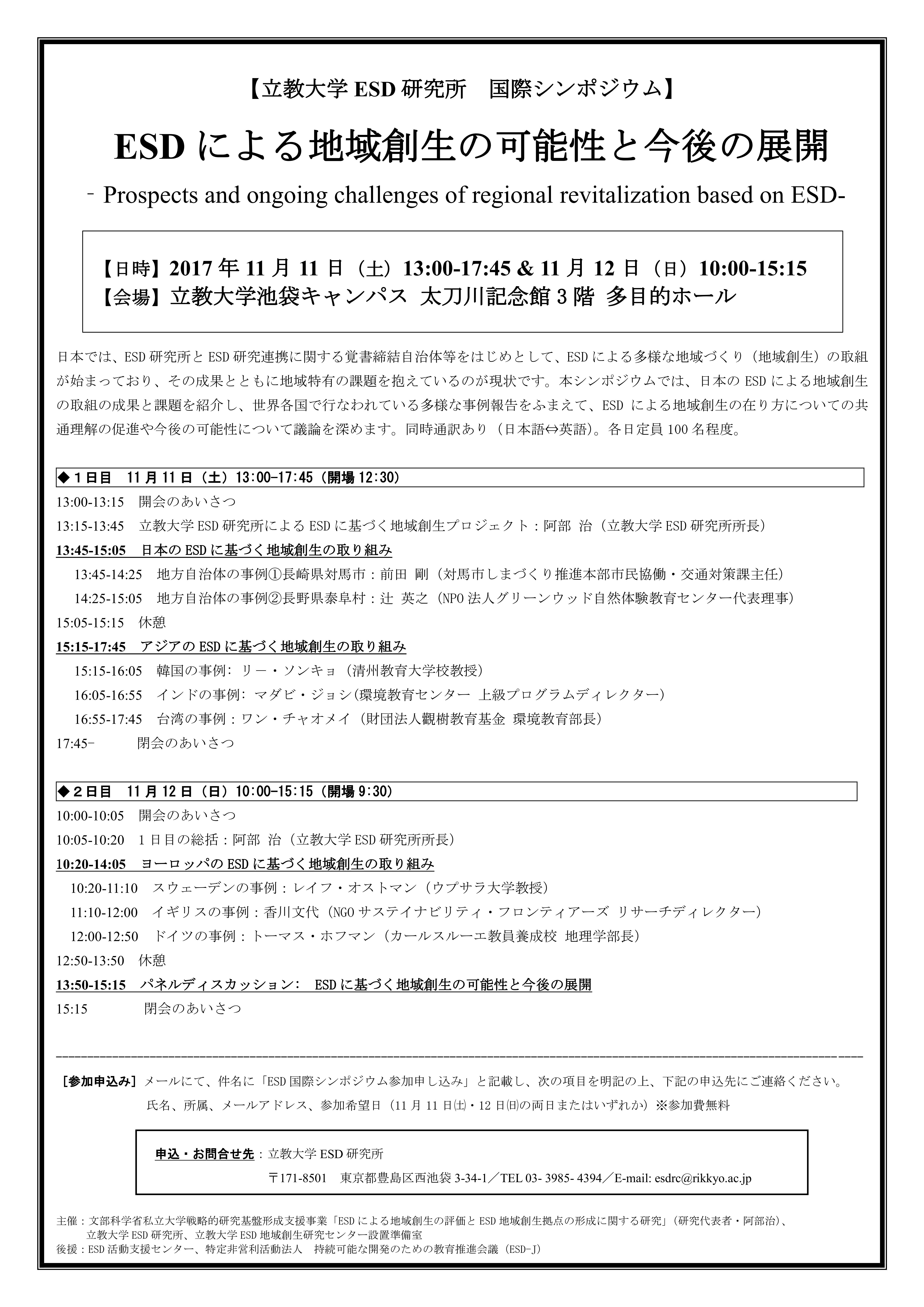 ESD-J代表理事の阿部治氏が所長を務める立教大学ESD研究所で、ESDと地域創生に関するシンポジウムが開催されます!