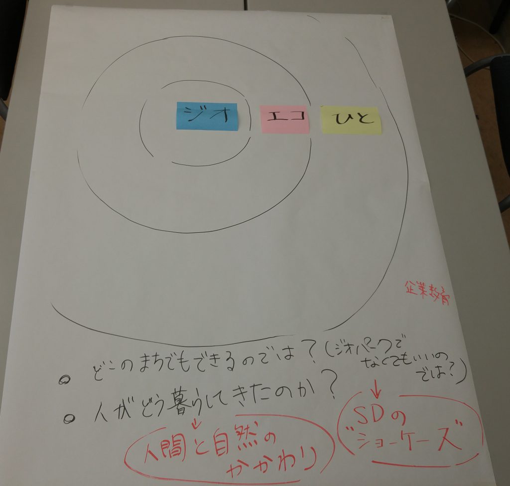 講師から話題提供して頂き、その時に出てきた事象を書き起こし、ジオ、エコ、ひとの3つに分類し、これらの事象について関係性や繋がりを見つけていく。