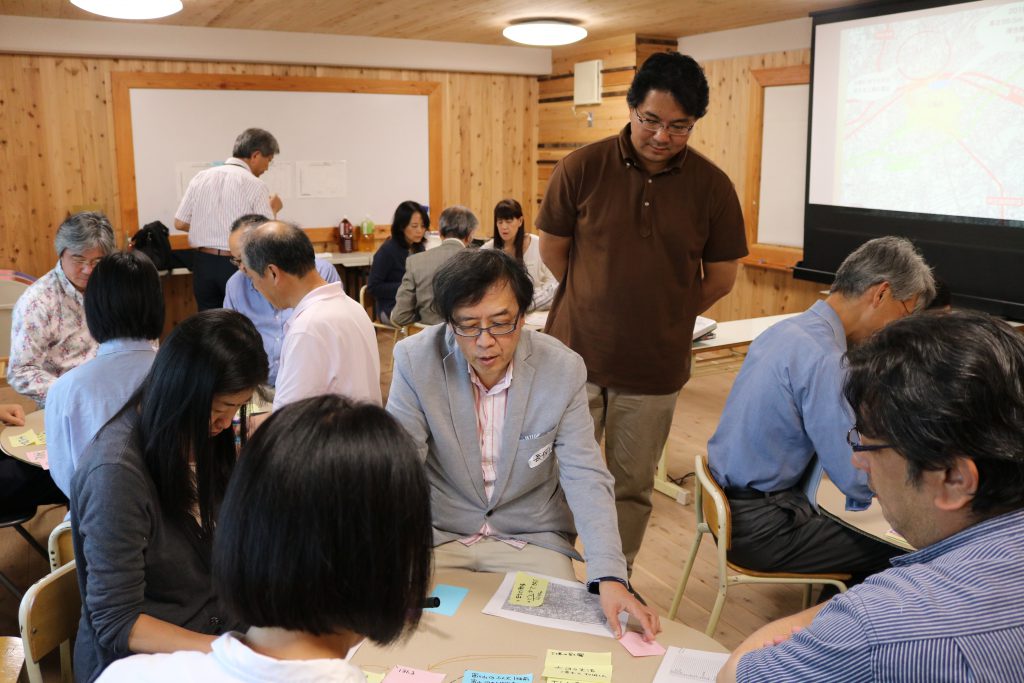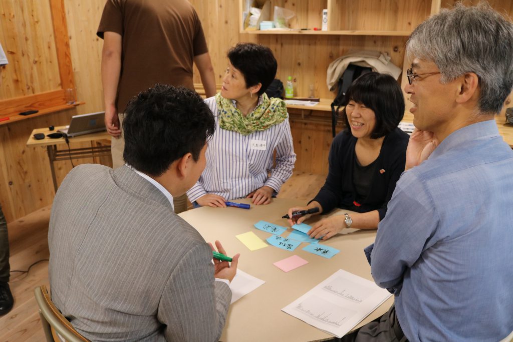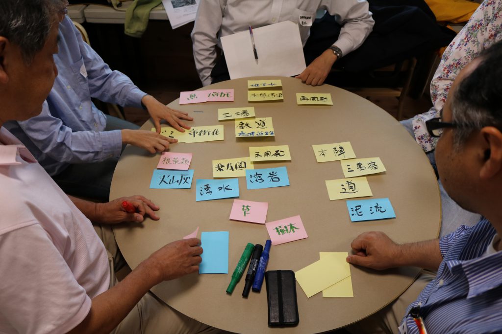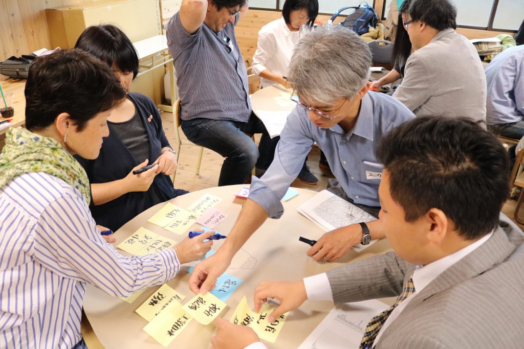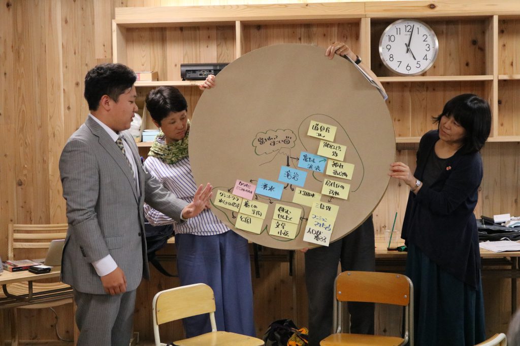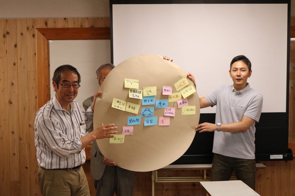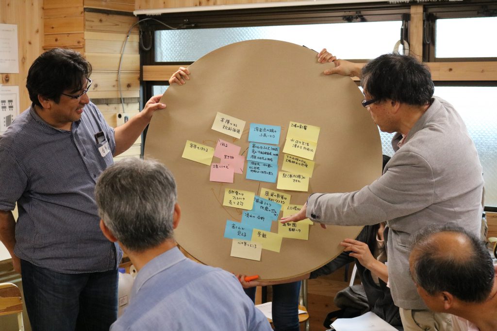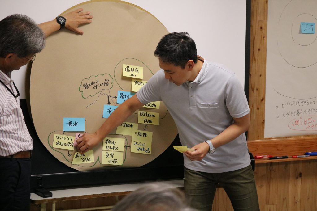参加者は話題提供の中で出てきた事象を書き起こし、ジオ、エコ、ひとの3つに分類し、関係性や繋がりを見つけていくというワークショップです。