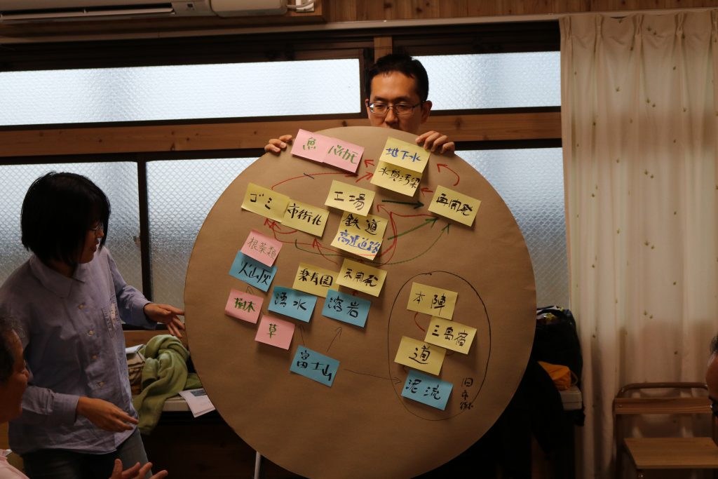 トークの後は、ジオパークで実際に野外教育として行っているフィールドワークの模擬体験ができるワークショップが行われました。静岡県三島市を題材に、三島市の特徴的な大地が形成された経緯、そこで育まれた人々の歴史や文化、生活、そして共生する動植物について学びます。また、現在三島市が抱える課題についても共有します。