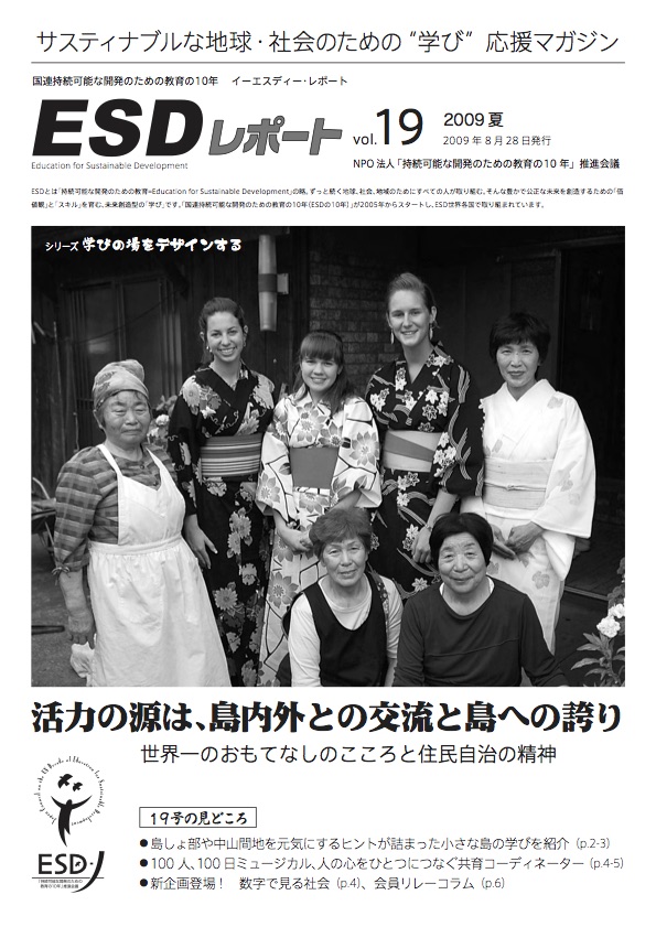 ESDレポート 第19号<2009.09.17> esd-j 投稿日: 2009/09/172020/08/26 お知らせ, その他, 人材育成, 協力連携, 国際事業, 政策提言 ◆シリーズ 学びの場をデザインする 活力の源は、島内外との交流と島への誇り 世界一のおもてなしのこころと住民自治の精神 ◆つなぐ人の視線<第5回>ワクワクを日本中で湧き上がらせたい〜情熱と感受性を磨く「共育の場」〜 ESDレポート 第19号(3.06MB)
