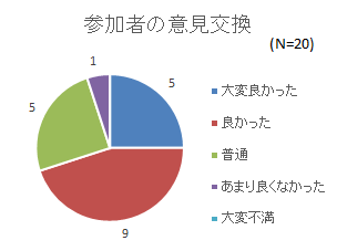 参加者による意見交換や質疑応答については、「良かった」が9名、「大変良かった」と「普通」が同数の5名ずつだった。もう少し参加者の発意を促す工夫が必要。 |