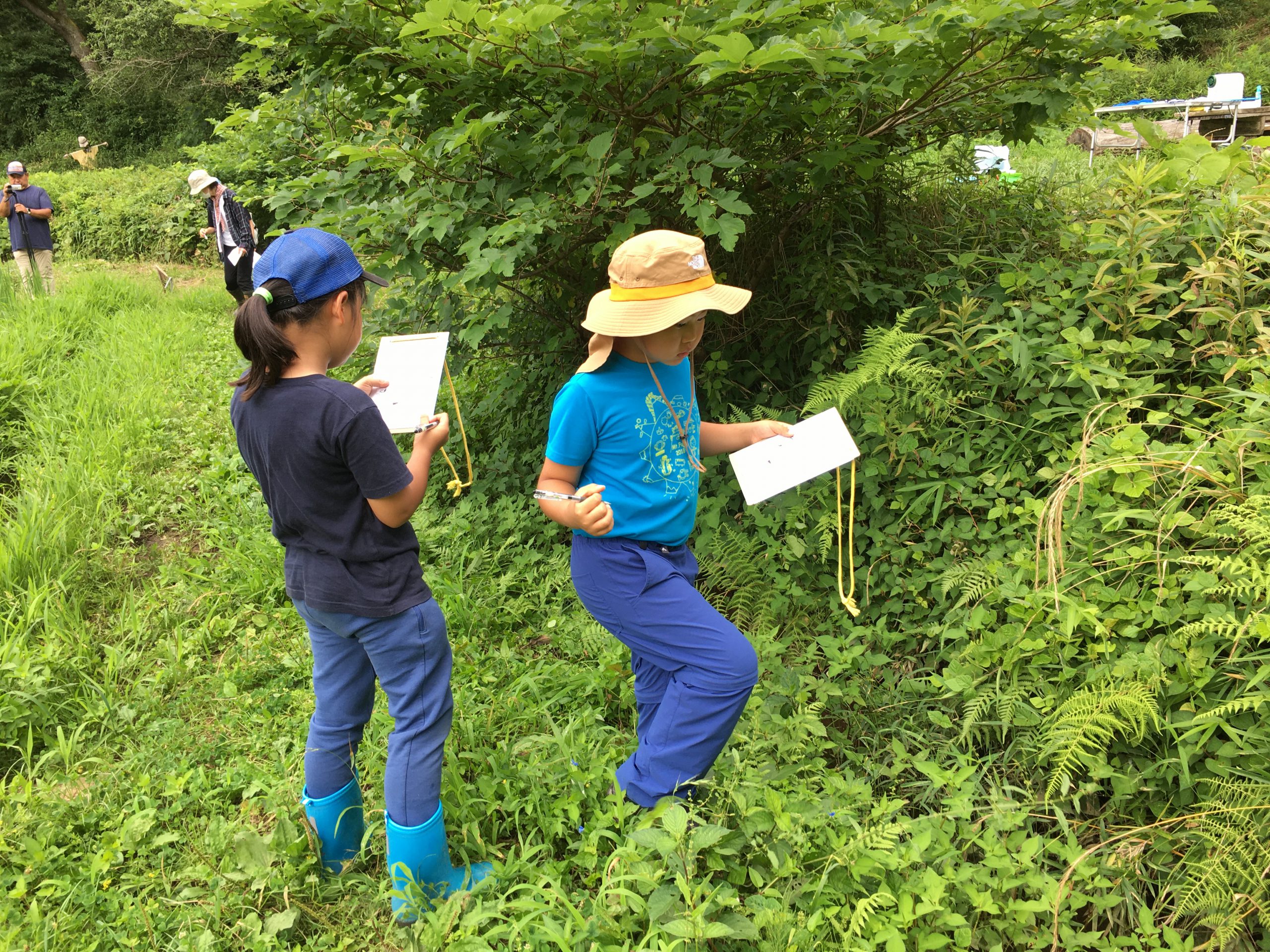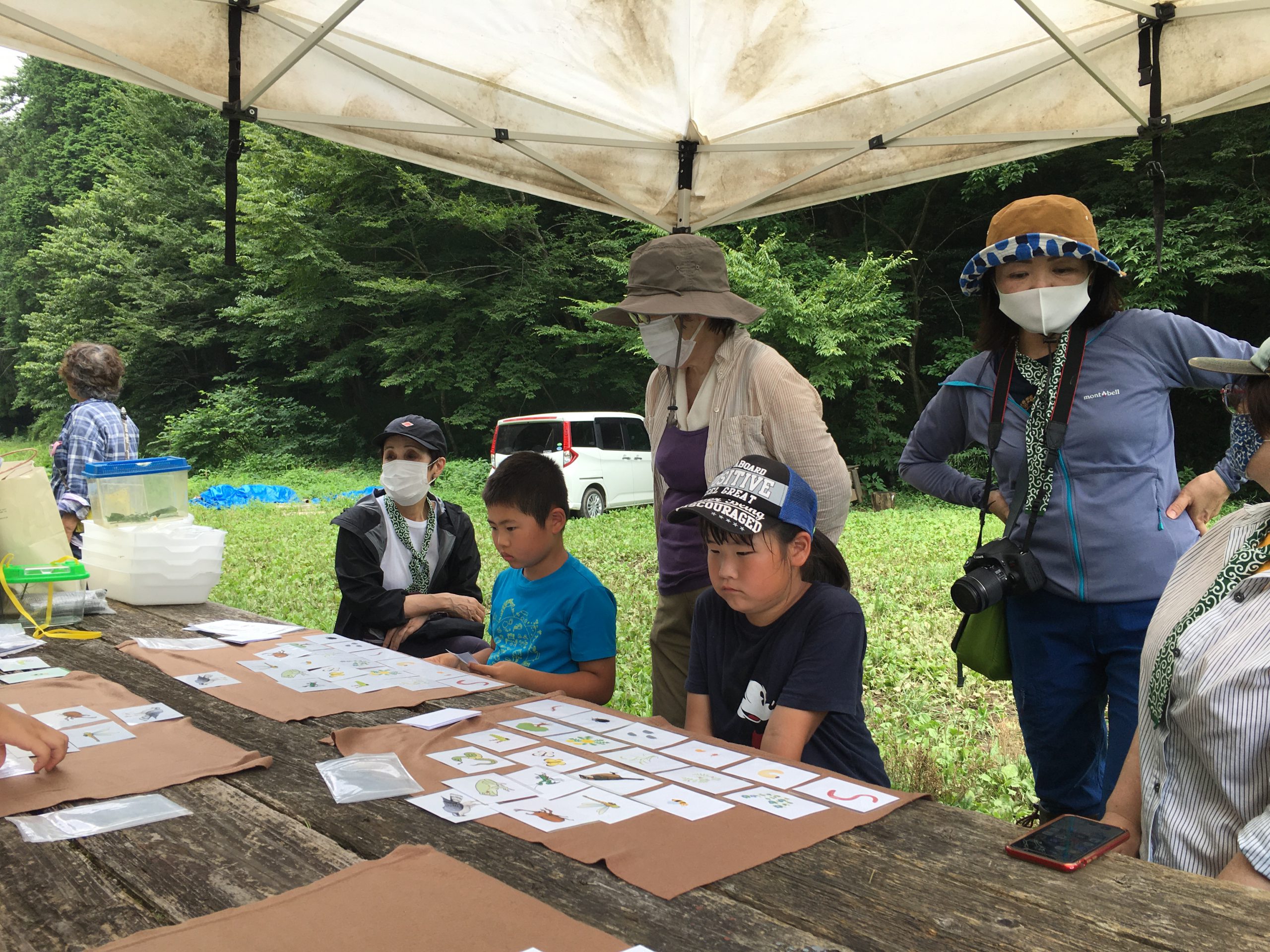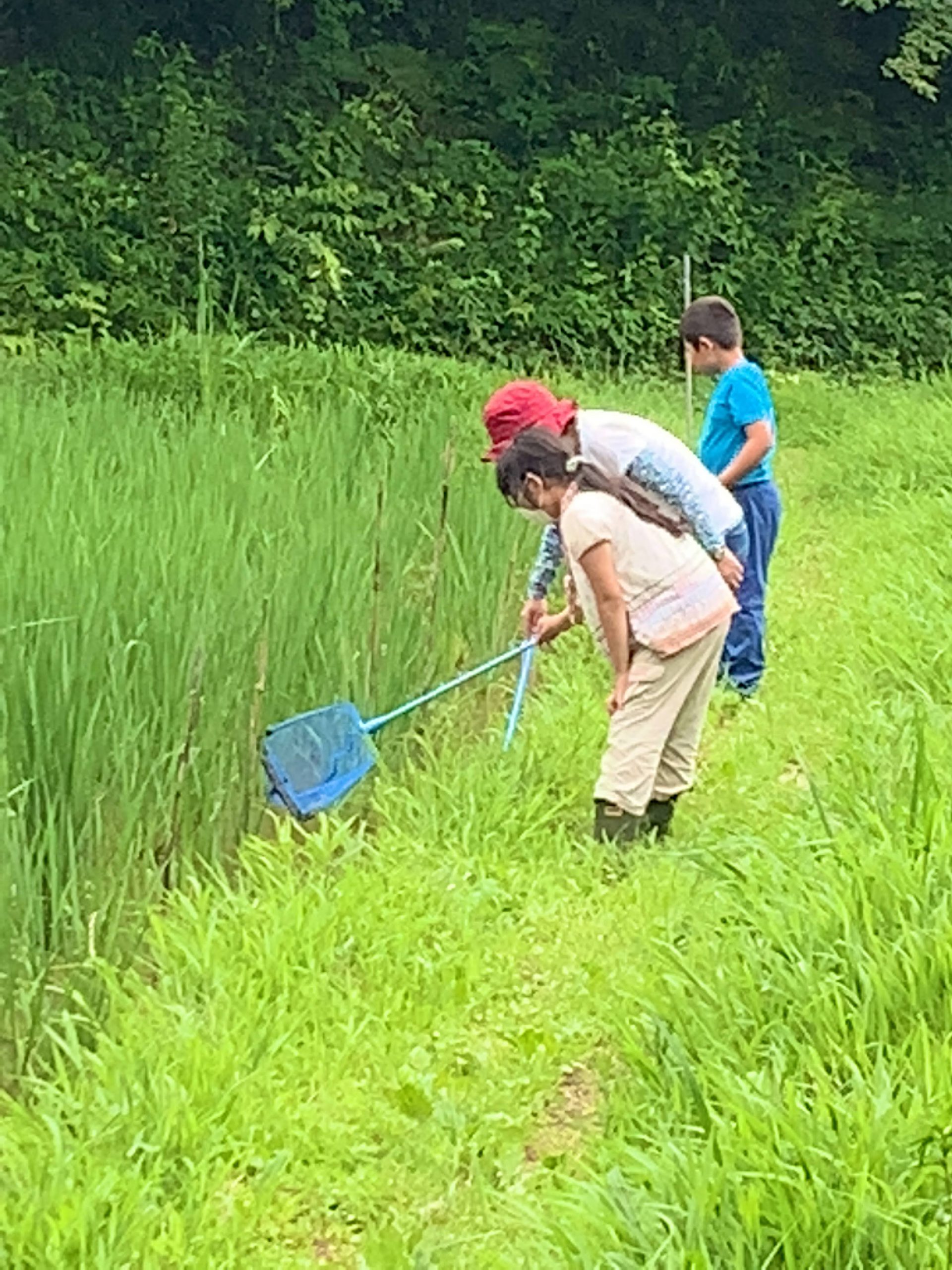 最初に、ヘビやスズメバチに出会っても、生きものは臆病なのでこちらから攻撃しなければ逃げていくことを教えて頂きました。午前中は「田んぼの生きものビンゴ」というマス目に生きものが描かれたカードを一人ずつ持ち、自由に生きものを探し、見つけた生きものをチェックするゲームをしました。自由時間は30分ごとに区切り、テントに集合して生きもの探しの結果をチェックすると同時に、こまめに給水時間を設けました。休憩時間には、足下に茂るオオバコを使って昔ながらの「オオバコ相撲」を楽しみました。