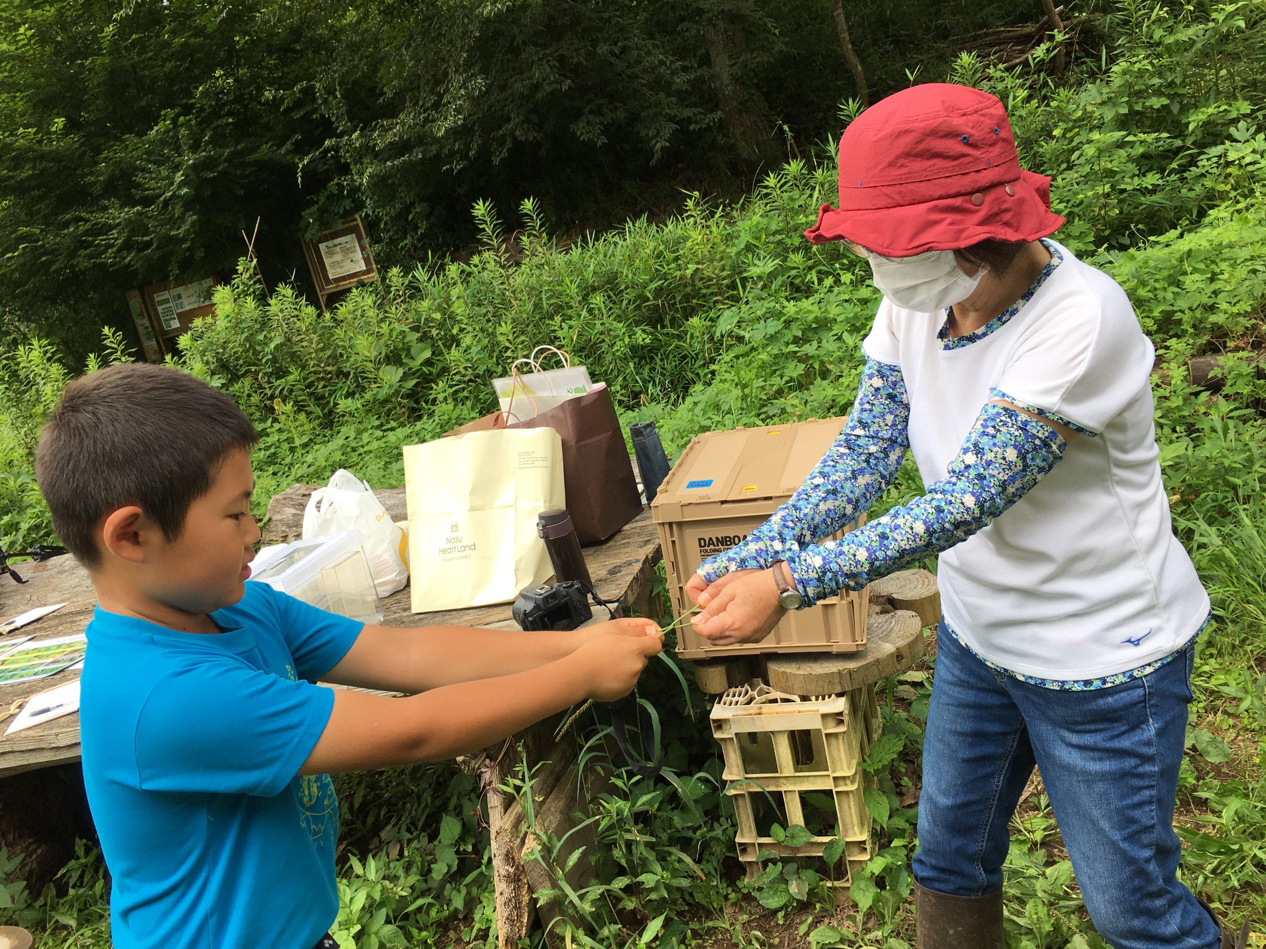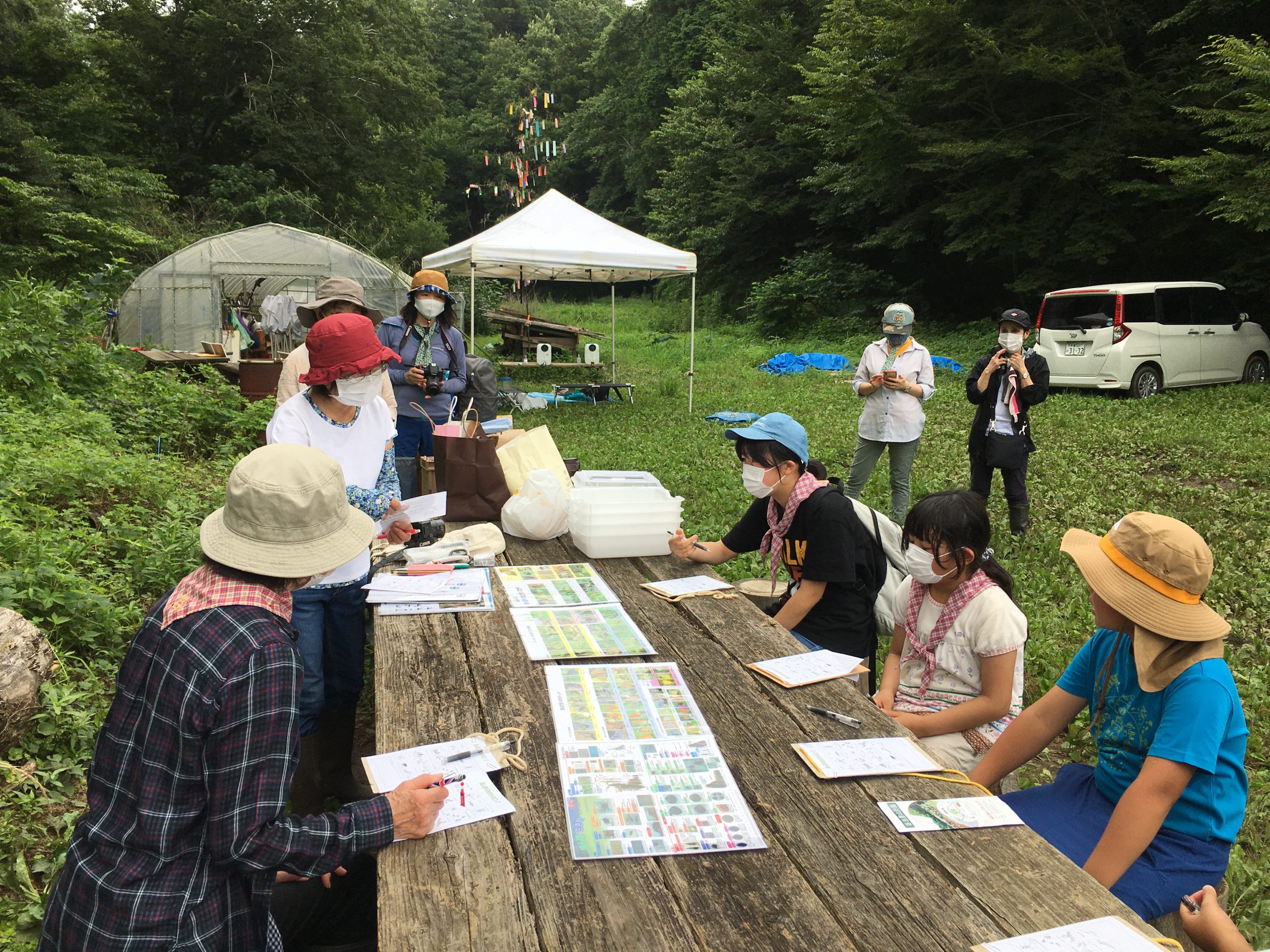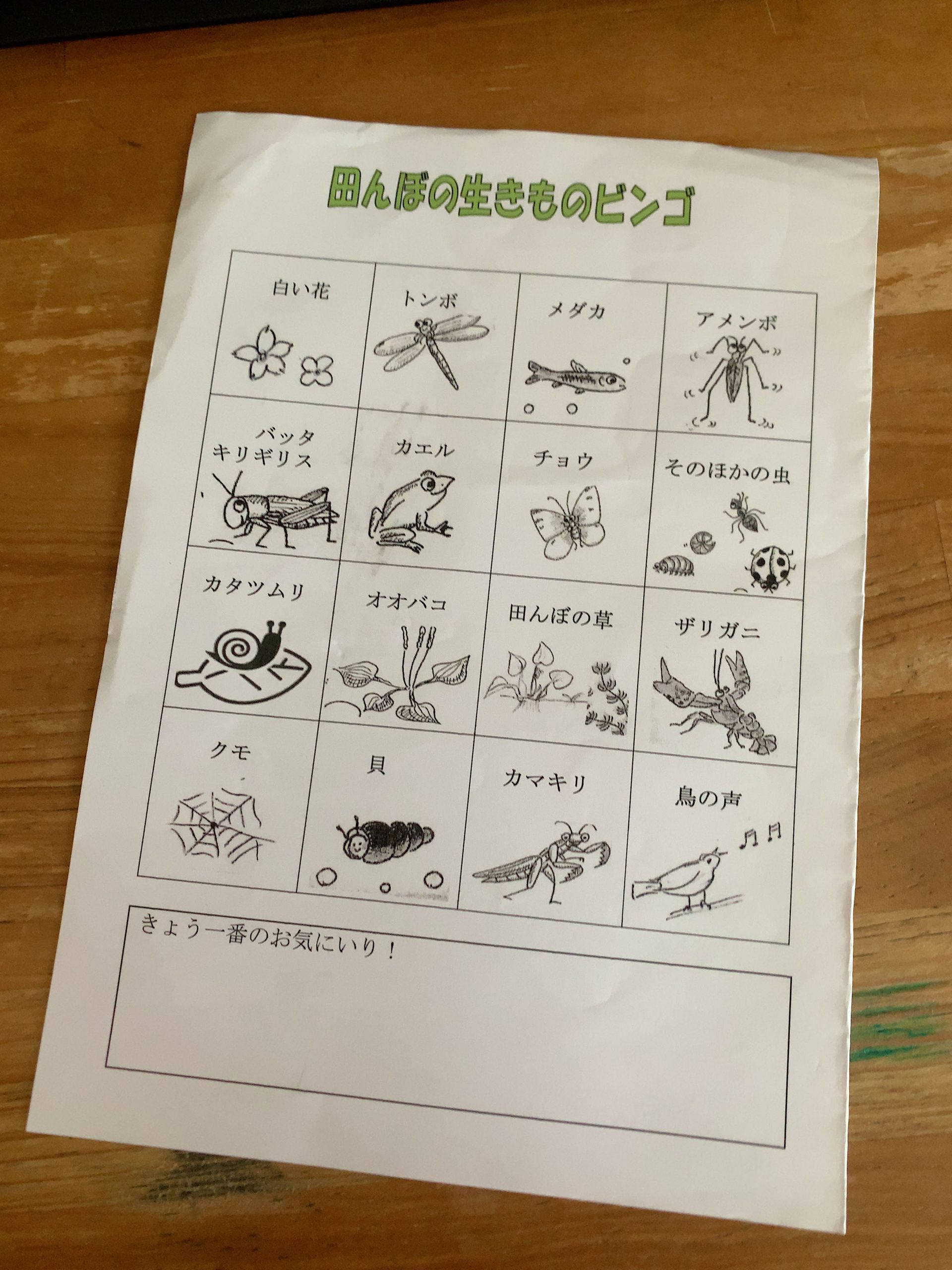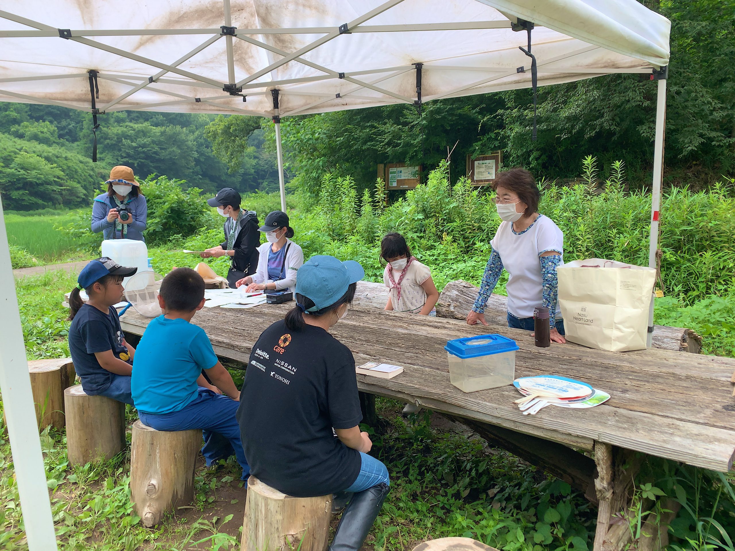 最初に、ヘビやスズメバチに出会っても、生きものは臆病なのでこちらから攻撃しなければ逃げていくことを教えて頂きました。午前中は「田んぼの生きものビンゴ」というマス目に生きものが描かれたカードを一人ずつ持ち、自由に生きものを探し、見つけた生きものをチェックするゲームをしました。自由時間は30分ごとに区切り、テントに集合して生きもの探しの結果をチェックすると同時に、こまめに給水時間を設けました。休憩時間には、足下に茂るオオバコを使って昔ながらの「オオバコ相撲」を楽しみました。