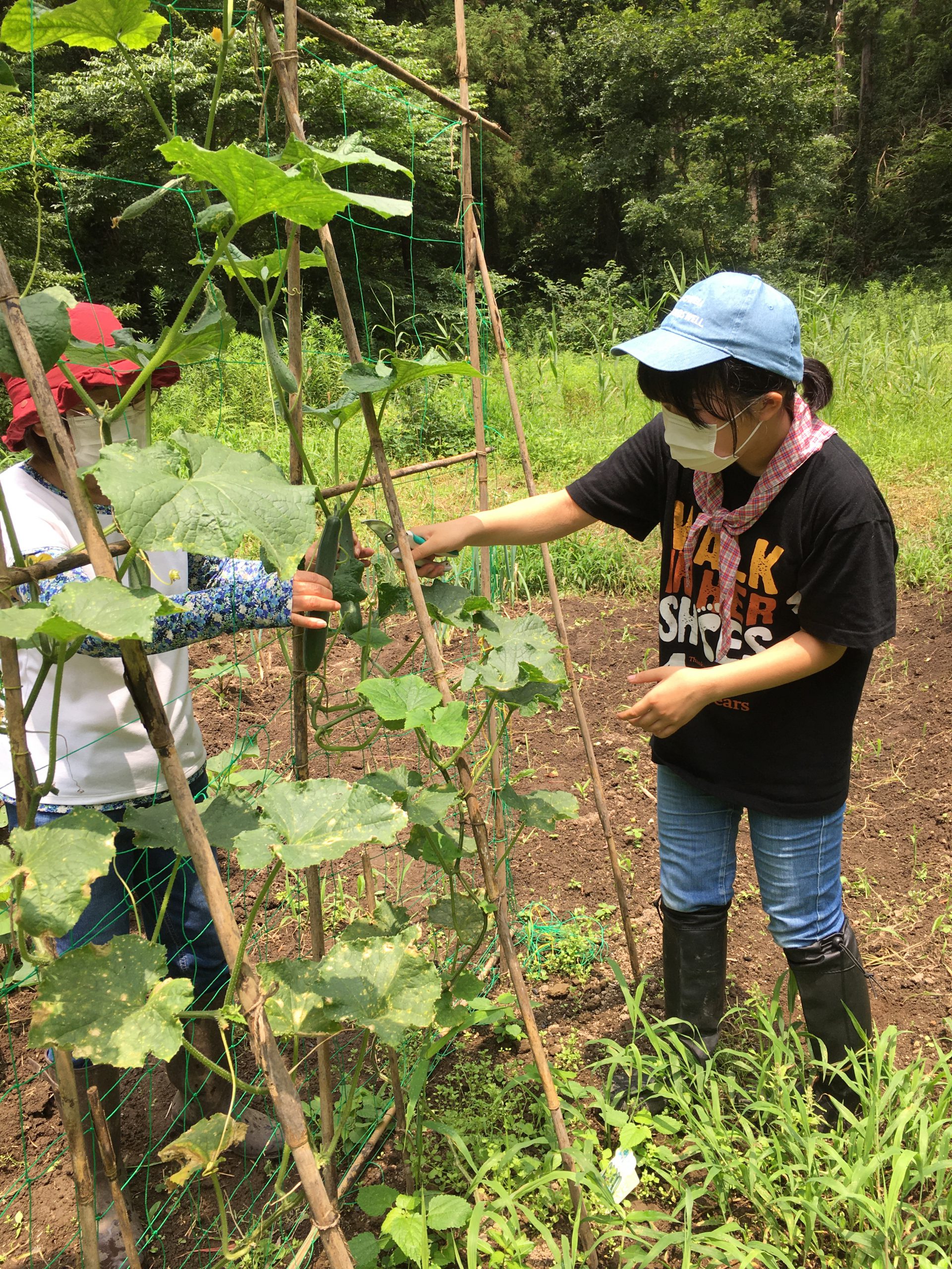 参加者は早朝から活動しているため、11時過ぎに早めの昼食休憩をとりました。小さな畑に人数分のキュウリがあると、子ども達に野菜の収穫体験もさせて頂きました。収穫したての新鮮なキュウリを川の水で冷やして直ぐ味わって欲しいという大人の思惑とは裏腹に、子どもはお土産に持って帰ると大事にしまい、誰一人その場で食べませんでした。