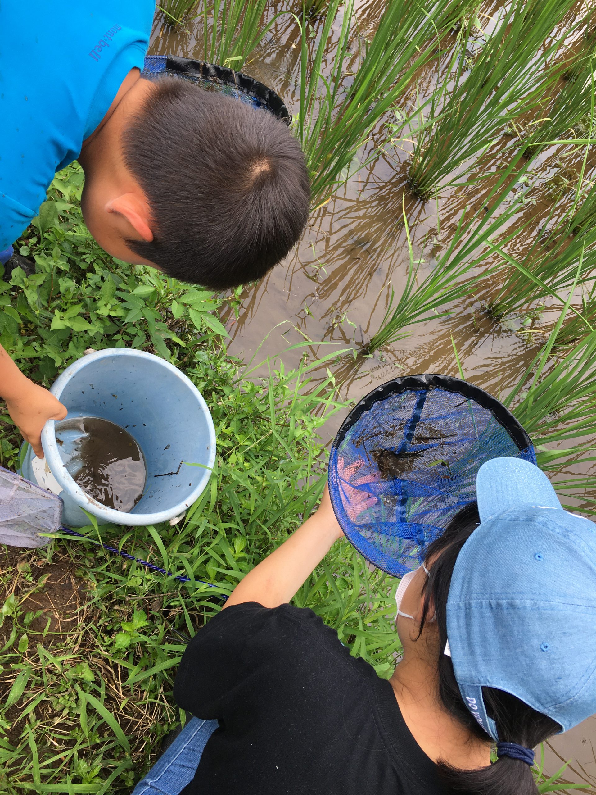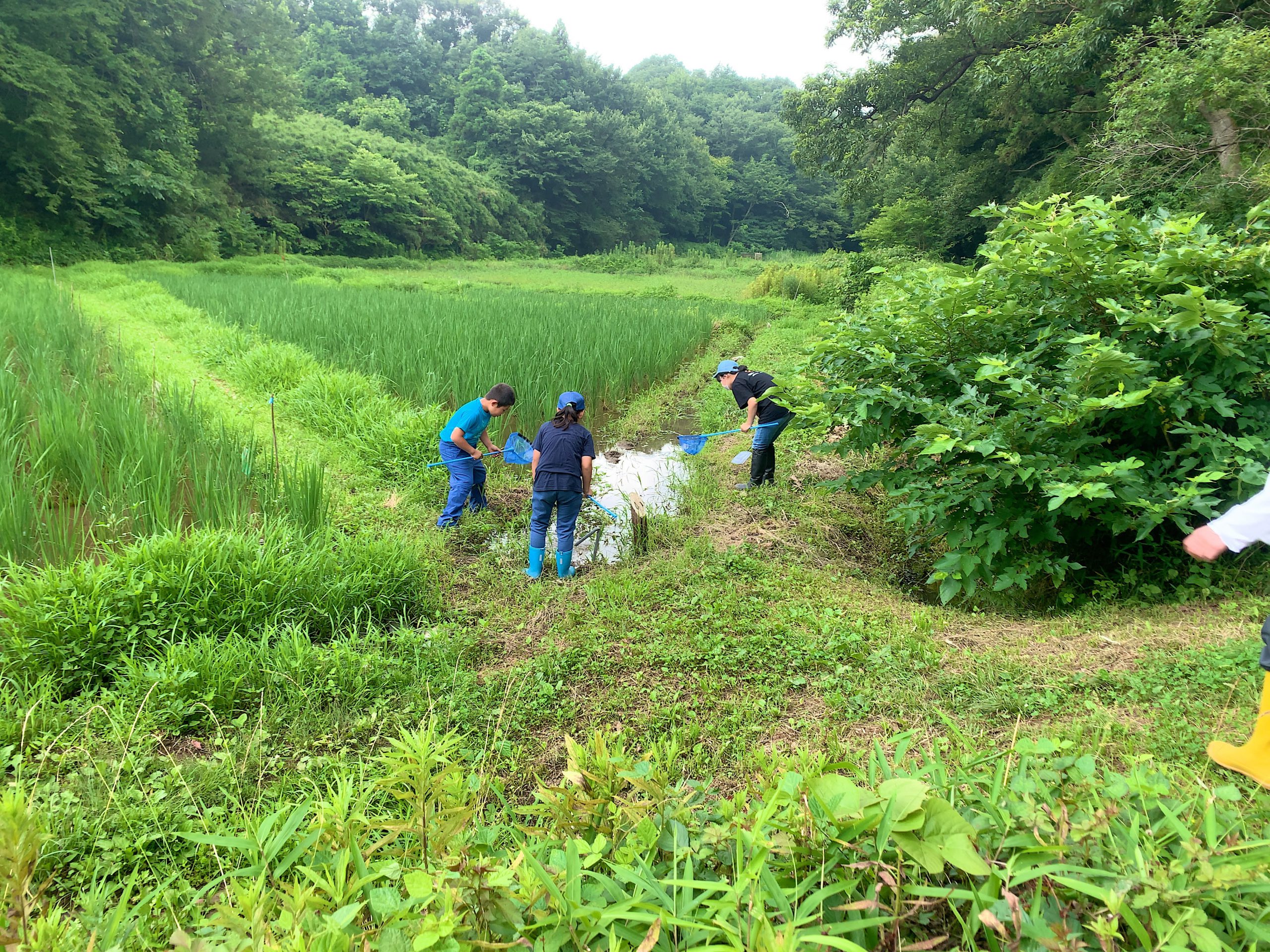 昼食後は、生きものの捕獲を楽しみました。たも網や捕虫網をめいめい手に持って、三々五々散っていきました。約束事はただ一つ、大人の見える範囲にいること。中央の台に置いたアクリル容器や虫カゴに、次々に捕獲した生きものが集まりました。アカガエル、ザリガニ、オタマジャクシ、ヤゴ、カワニナ、チョウ、トンボ、カマキリ、蜘蛛、バッタ等、子ども達の人気No.1は、ザリガニでした。しかし、ザリガニは田んぼにとって良くないことを晝間さんから教えていただき、子ども達は驚きました。残念ながらカブト虫の時期には早かったようで、樹液の出る木にはカナブンばかりが集まっていました。