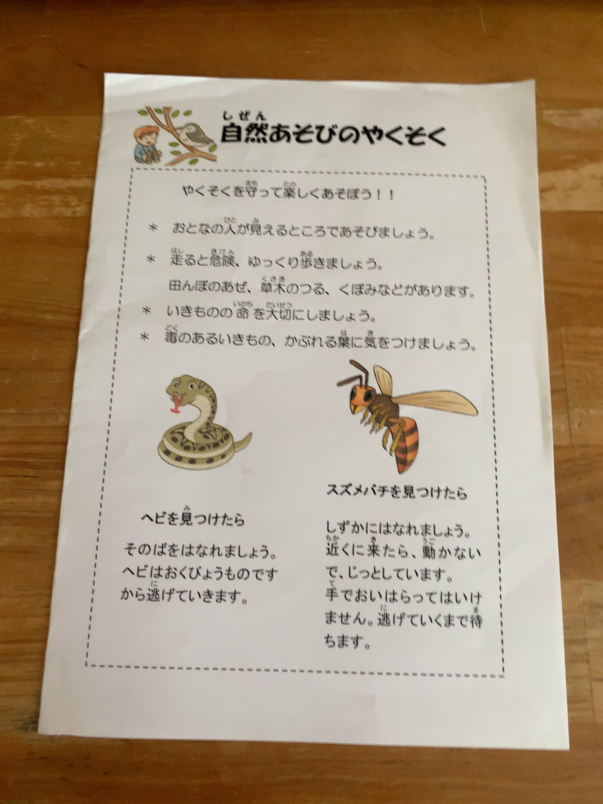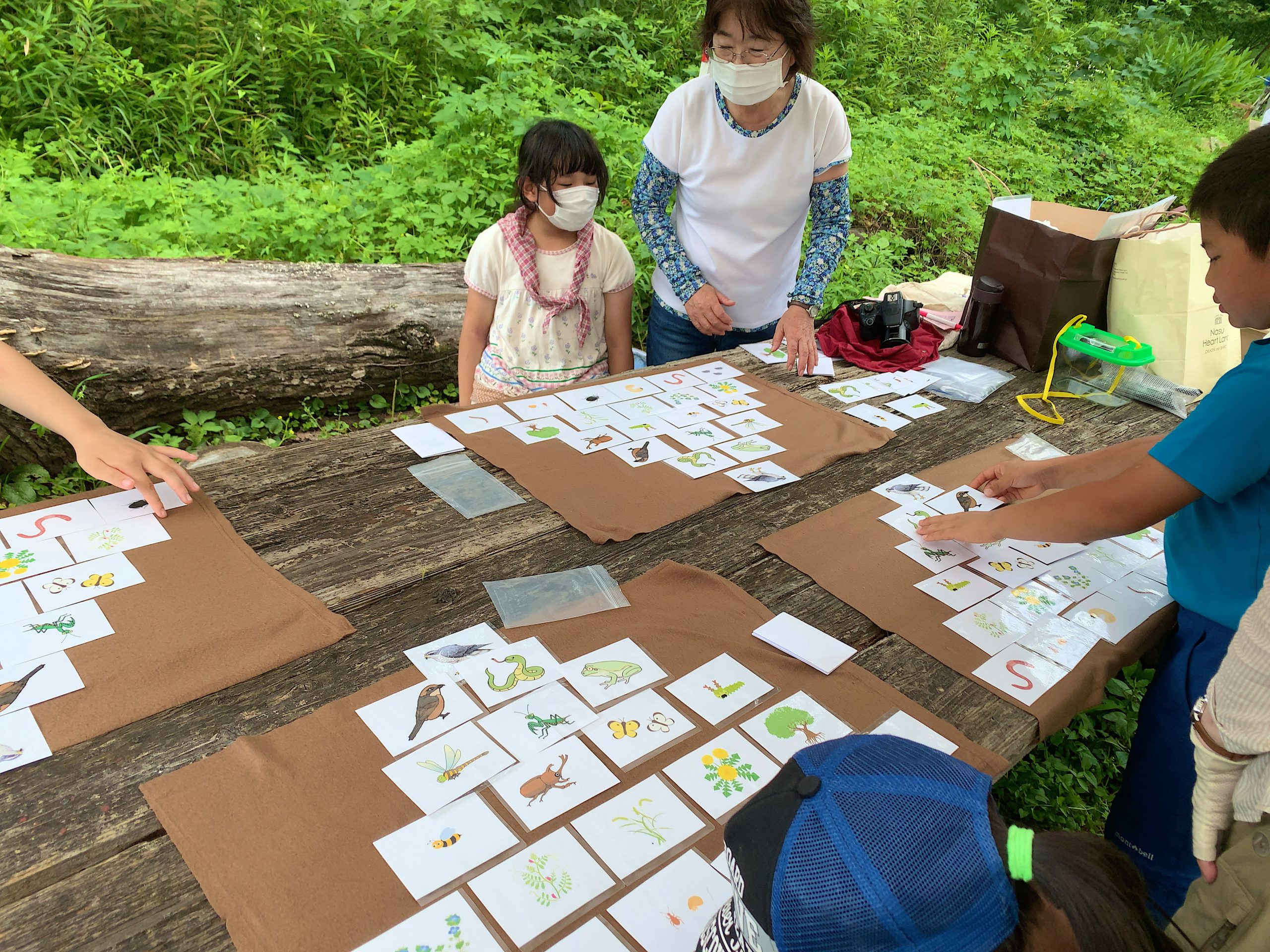 捕獲した生きものの生態や特徴を、ひとつひとつ晝閒さんから解説して頂いた後、捕まえた生きものは、すべて元の場所へ放ちました。そして、生きものが書いてあるカードを子どもたちなりに考えながら食物連鎖の関係に並べて、生態系ピラミッドを作りました。解散までの最後の自由時間は、林の中のハンモックで遊ぶ人、もう一度、田んぼに入る人、疲れて休憩する人、それぞれ自由に過ごしました。