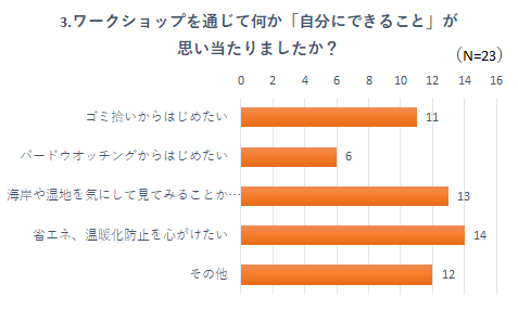 また、このワークショップを通じて今後自分ができることとして、省エネ・温暖化防止を心がけたい(14名)、海岸や湿地を気にしてみることから始めたい(13名)、ゴミ拾いから始めたい(11名)、バードウォッチングから始めたい(6名)といった次のステップに繋がる回答が参加者から得られました。