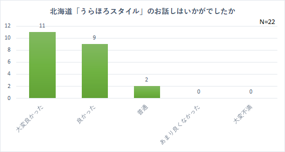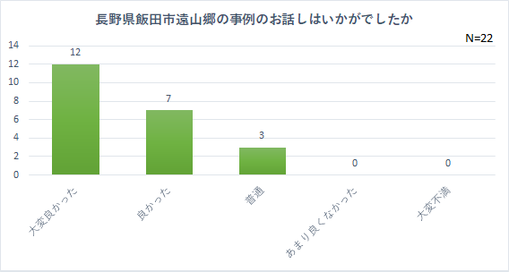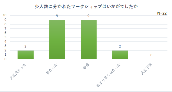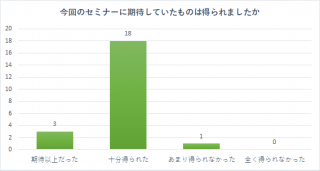 講師2名による事例紹介については、半数以上の方が大変良かったと回答し、非常に有意義なインプットが出来たと思います。休憩の後、少人数グループに分かれて話し合いをするワークショップは、良かった9件、普通9件でした。セミナーに期待していたものが得られたか?については、期待以上だった3件、十分得られた18件で、概ね満足いただけた結果となりました。