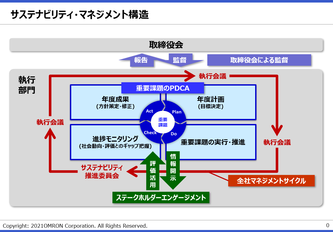 2017年度には、全社マネジメント構造を確立し、サステナビリティ目標の達成に向けた取り組みが強化されました。取締役会がサステナビリティ方針を設定し、サステナビリティ課題に対する取り組みの監視・監督機能を果たしています。また、社内取締役及び執行役員の中期経営計画期間における中長期業績連動報酬を決定する際のKPIのひとつに、第三者機関のサステナビリティ指標に基づく評価を採用しています。第三者機関のサステナビリティ評価を採用することで、公正性・透明性を高めています。更にサステナビリティ方針・目標・KPI・進捗状況をウェブサイトや統合レポートなど様々な媒体で開示することで、ステークホルダーとの対話を強化し、取り組みの進化に活かしています。