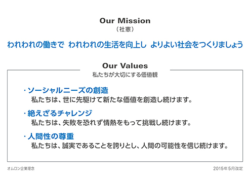 1959年に創業者・立石一真氏が制定した「社憲」は「われわれの働きで、われわれの生活を向上し、よりよい社会をつくりましょう」というもので、企業は利潤追求だけでなく、社会の持続的発展に貢献し続けてこそ存在する意義があり、事業を通じて社会的課題を解決し、よりよい社会をつくるという企業の公器性の思いが込められています。この社憲の精神を企業理念として受け継ぎ、企業経営における求心力の原点としています。