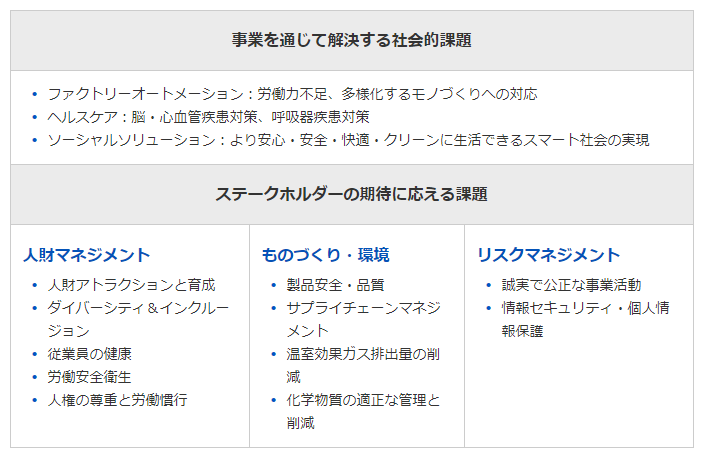 サステナビリティ重要課題は、「事業を通じて解決する社会的課題」と「ステークホルダーの期待に応える課題」の2軸で設定されています。「事業を通じて解決する社会的課題」とは、オムロンの注力ドメインと親和性の高い社会的課題から、事業戦略において注力すべき重要課題を抽出したものであり、ファクトリーオートメーション、ヘルスケア、ソーシャルソリューションの3分野です。「ステークホルダーの期待に応える課題」とは、VG2.0の遂行を支える事業基盤を強化することで、人財マネジメント、ものづくり・環境、リスクマネジメントの3分野に分類されます。事業戦略と運営機能戦略が一体となってこそ、持続可能な社会づくりに貢献できるとの考えに基づいています。具体的な内容は以下の通りです。