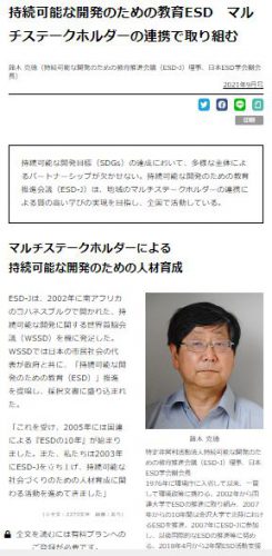月間先端教育2021年9月号に産官学民連携による環境人材育成『「マルチステークホルダーの連携で取り組む持続可能な開発のための教育「ESD」』というタイトルで当団体の鈴木克徳理事がインタビューに答えた記事が掲載されています(P36-37)。